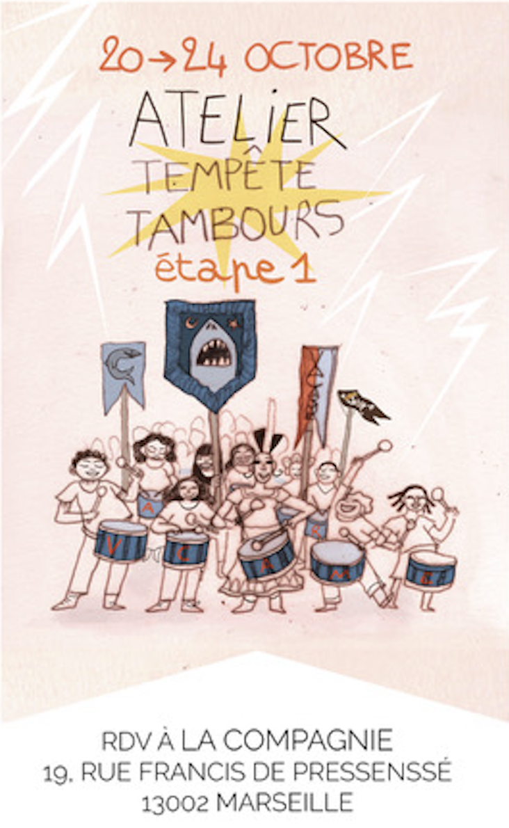 Mais chaque chose en son temps. Pour cet atelier, nous invitons les enfants de la batucada marseillaise Vacarme orchestra et les enfants du quartier de Belsunce à venir se préparer à incarner cette tempête joyeuse et habitée. Ils sont le tonnerre avant le calme, ce sont eux, jeunes habitants des quartiers de Noailles et Belsunce, qui portent l’énergie concentrée de la vie et de la joie quand elle est collective, leur maîtrise des tambours insuffle la vie vivante.