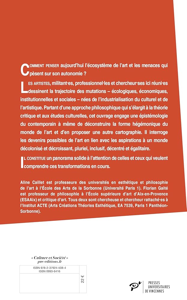 Comment penser aujourd’hui l’écosystème de l’art et les menaces qui pèsent sur son autonomie ? Les artistes, militantes, professionnel·les et chercheur ses ici réunies dessinent la trajectoire des mutations – écologiques, économiques, institutionnelles et sociales – nées de l’industrialisation du culturel et de l’artistique. Partant d’une approche philosophique qui s’élargit à la théorie critique et aux études culturelles, cet ouvrage engage une épistémologie du contemporain à même de déconstruire la forme hégémonique du monde de l’art et d’en proposer une autre cartographie. Il interroge les devenirs possibles de l’art en lien avec les aspirations à un monde décolonisé et décroissant, pluriel, inclusif, décentré et égalitaire. Il constitue un panorama solide a l’attention de celles et ceux qui veulent comprendre ces transformations en cours.